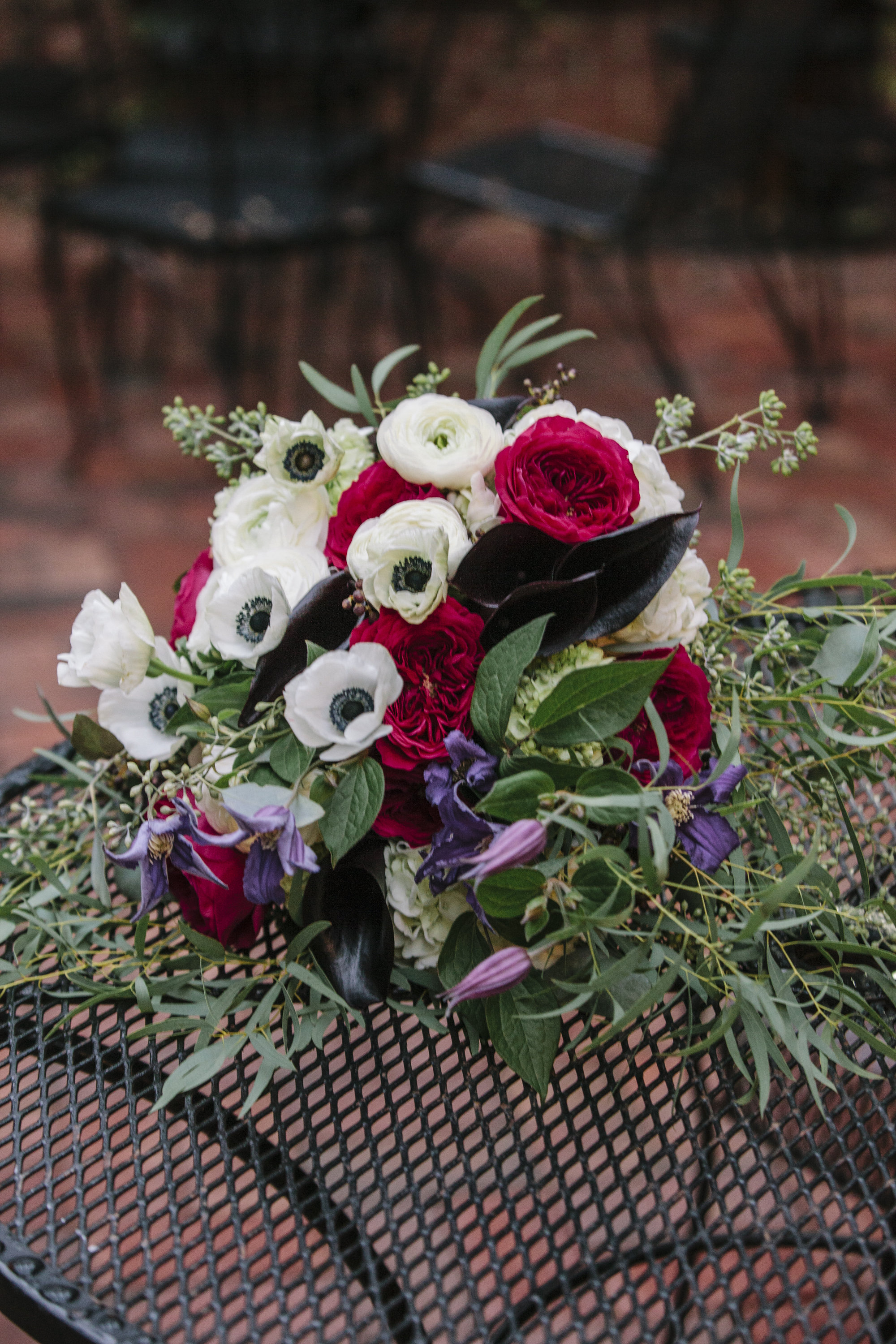 Emily and Ryan's wedding was at the Tabard Inn in Washington, DC on a gorgeous November day. The bridal bouquet was a loose, organic design featuring berry pink garden roses, anemones, purple clematis, eggplant calla lilies, white ranunculus, hydrangea and privet berries along with seeded and willow eucalyptus. Her bridesmaid carried a similar but smaller bouquet and Ryan wore a boutonniere of purple hydrangea and a single anemone. The ceremony was held upstairs in the Tabard Inn's intimate, Victorian dining room complete with gorgeous fireplaces and tons of candlelight. The couple was married in front of one of the fireplaces which was accented with a long and low arrangement of antique hydrangea, garden roses, snapdragons, lisianthus, privet berries and eucalyptus in a gold bowl with lots of gold mercury glass candles. Adorning both sides of the fireplace were two tall arrangements of curly willow, callicarpa, antique hydrangea and snapdragons. The windowsills were all accented with mixed eucalyptus garlands and votive candles. The centerpieces for the reception were designed in gold pumpkins with kale, purple stock, white roses and lots of berries and foliage along with gold votive candles.
